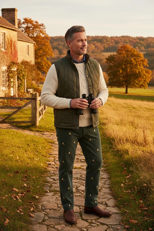 Our stretch corduroy provides the comfort and freedom of movement That every man  is looking for. The popular fall classic of the pheasant on olive green is ready  to wear to  most events or just sitting by the fire with your favorite IPA Wear the Yellow or Navy surcingle belt to complete the look